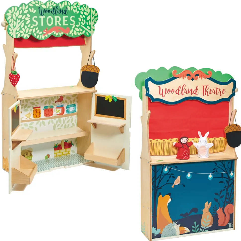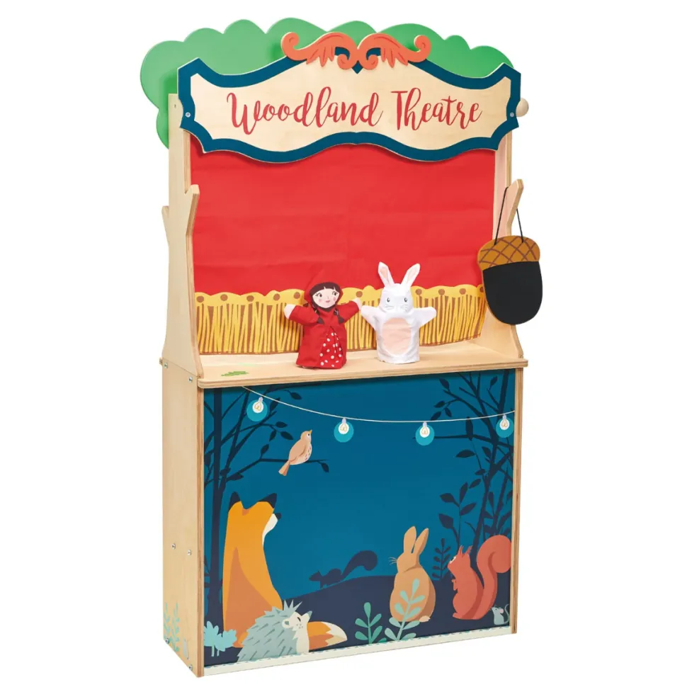 Auf Der Anderen Seite Des Kaufmannsladen Befindet Sich Das Woodland Theater. Zwei Niedliche Handpuppen Sind In Der Lieferung Ebenfalls Inkludiert. Auf Die Tafel, Die Wie Eine Eichel Geformt Ist, Konnt Ihr Den Zeitpunkt Der Nachsten Vorstellung Schreiben. Der Rote Vorhang Fallt, Wenn Das Theater Vorbei Ist.
