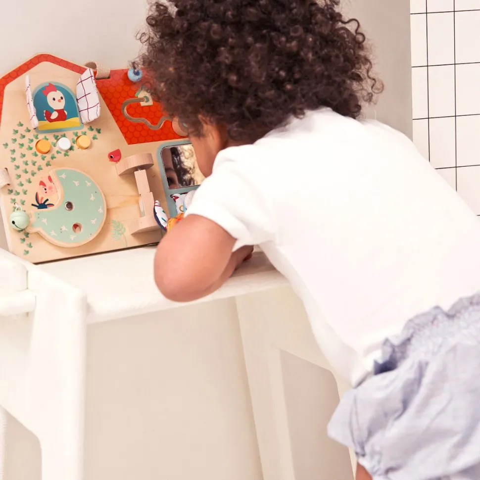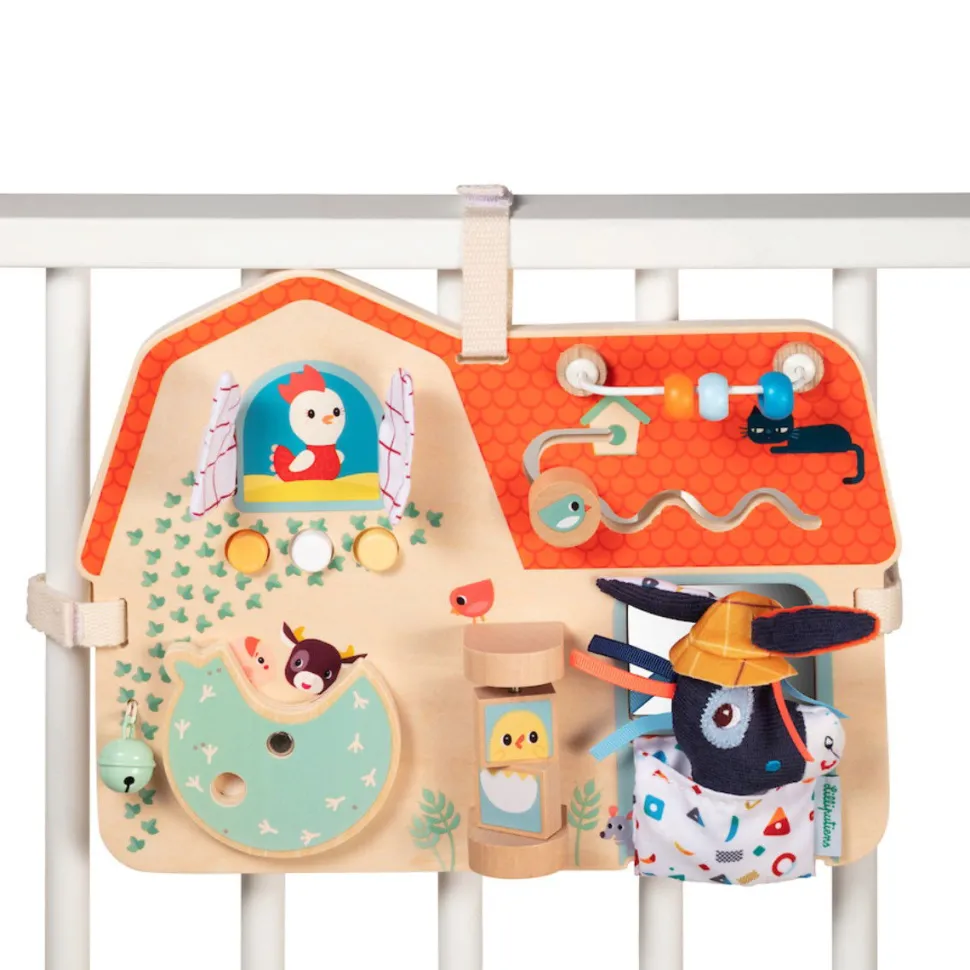 Hier Kann Dein Kind Seine Feinmotorik Und Neugierde Stimulieren, Indem Es Offnet Und Schliest, Den Vogel Begrust, Sich Selbst Im Spiegel Betrachtet Und Mit Der Kuh Spielt.