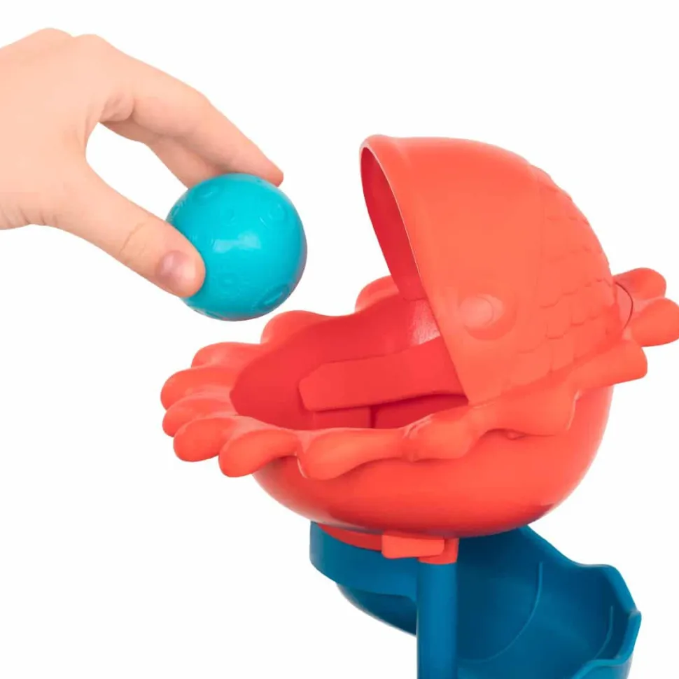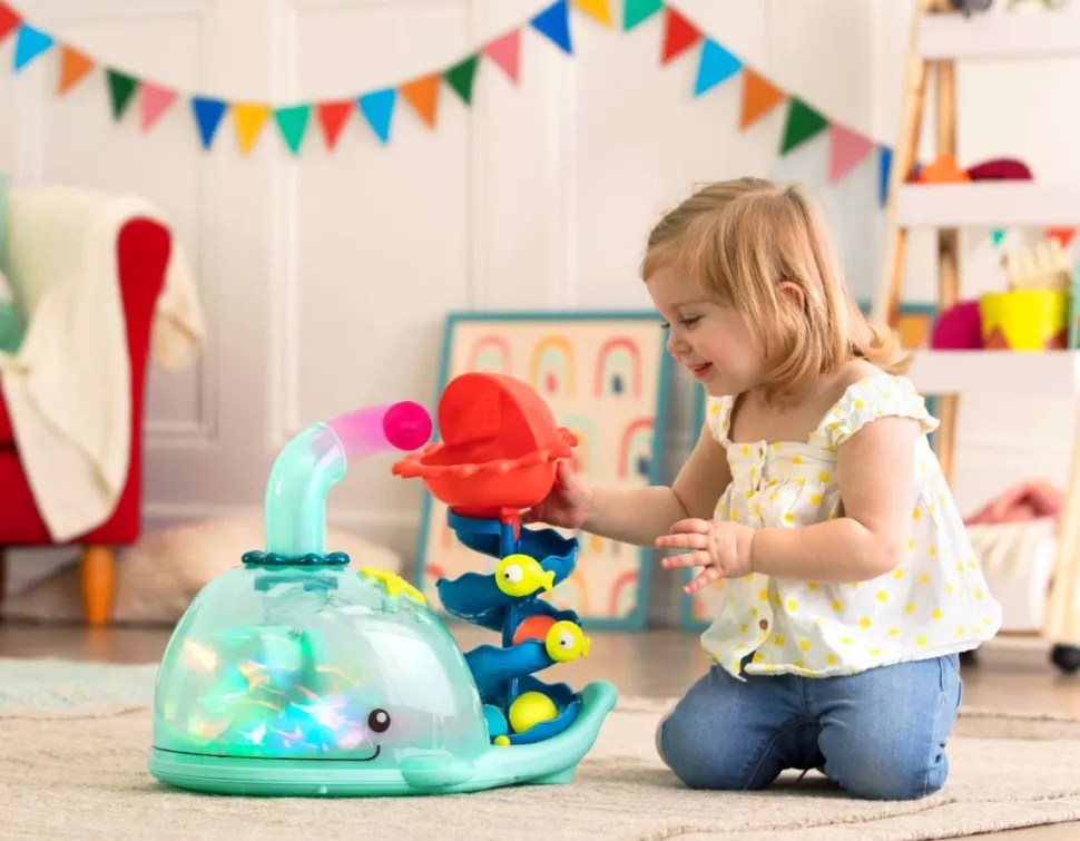 Wenn Dein Kind Den Knopf Oben Am Wal Druckt, Springt Eine Von 5 Kugeln Aus Dem Loch Und In Das Maul Des Roten Fisches.Die Kugel Rollt Die Spiralbahn Hinunter Und Wieder In Den Bauch Des Wals.Die Nachste Kugel Ist Dann An Der Reihe.