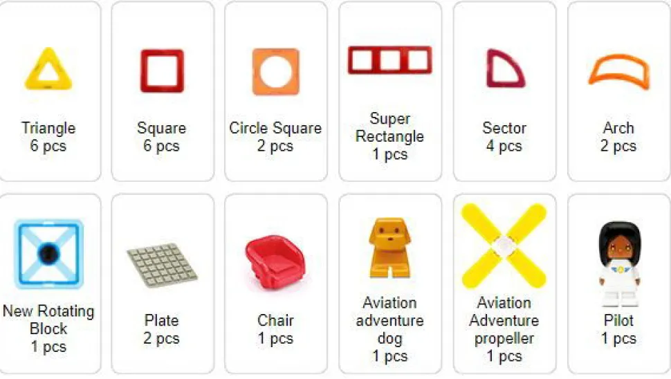 Unter Den 28 Teilen Findest Du Einzigartige Und Neue Magformers Teile. Ein Pilot, Ein Abenteuerlicher Begleithund Und Ein Spezielles Drehbares Element Sind Dabei, Damit Ihr Rotierende Flugel An Eure Fliegende Konstruktion Dranmontieren Konnt.