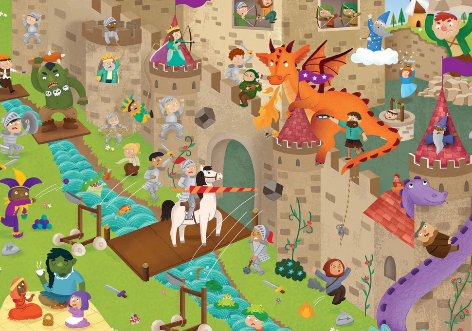 50-Teiliges Puzzle Mit Aufregendem Drama, In Dem Die Burg Sowohl Vom Drachen Als Auch Vom Ork Angegriffen Wird.Wer Ist Eigentlich Gegen Wen?Daruber Kann Man Sich Gut Unterhalten – Es Starkt Den Wortschatz Deines Kindes.