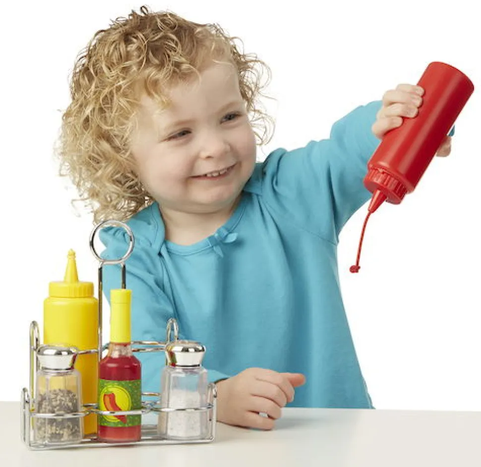 Schone Erganzungen Für Die Spielkuche Von Kleinen Leckermaulern.Ketchup, Senf, Chilisauce, Salz Und Pfeffer. Das Beste Ist, Dass Der Inhalt Der Flaschen Richtig „Spritzt“ – Es Sind Zwar Schnure, Aber Es Sieht Verdammt Echt Aus. Die Gerausche Und Das Aussehen Sind Einfach Perfekt. Ab 3 Jahren.