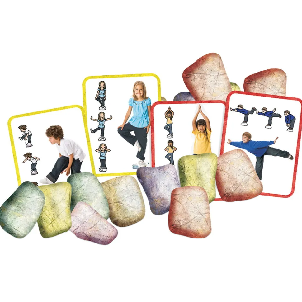Tritt Auf Die Kunststoffsteine Und Ahme Die Figur Auf Der Karte Nach. Mit Den Inspirationskarten Konnen Auch Mehrere Kinder Gemeinsam Aktiv Werden Und Spielerisch Ihr Gleichgewicht Starken, Wahrend Sie Die Bewegungen Auf Den Karten Nachmachen.