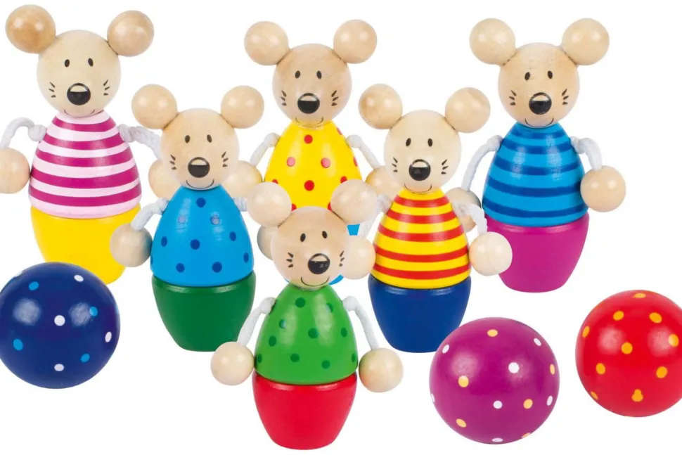 6 Kleine, Freche Mause Mit Frechem Lacheln In Schonen Farben Und 3 Holzkugeln, Mit Denen Du Versuchen Musst, Die Mause Umzuwerfen.