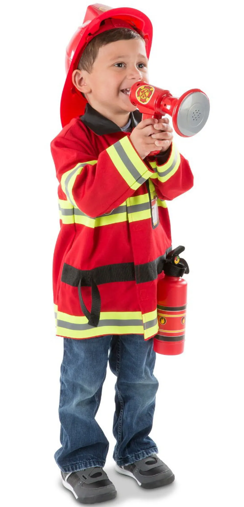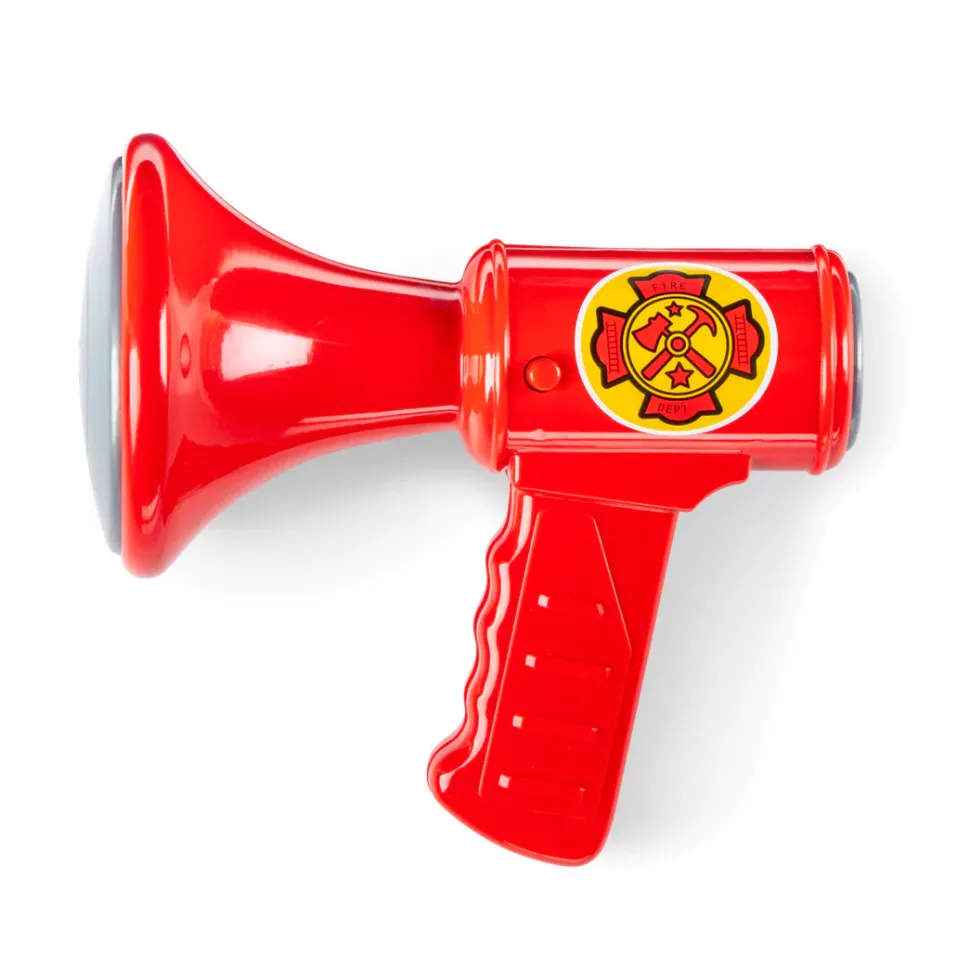 Ein Feuerwehrhelm, Ein Feuerloscher (Requisite), Ein Megafon Mit Soundeffekten, Ein Feuerwehrabzeichen Und Ein Namensschild.