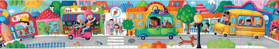 Langliches Puzzle Mit 26 Teilen Mit Schonem Und Lebendigem Motiv, Welches Das Leben Entlang Einer Strase Mit Hausern Zeigt.