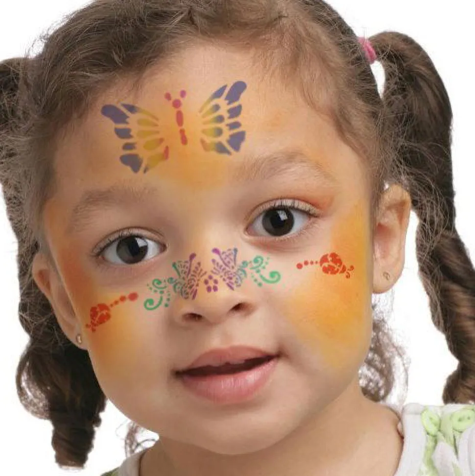 Das Gewunschte Motiv Auf Der Schablone Wird Auf Das Gesicht Gelegt Und Mit Pinsel Oder Schwamm Schminkfarbe Aufgetragen.