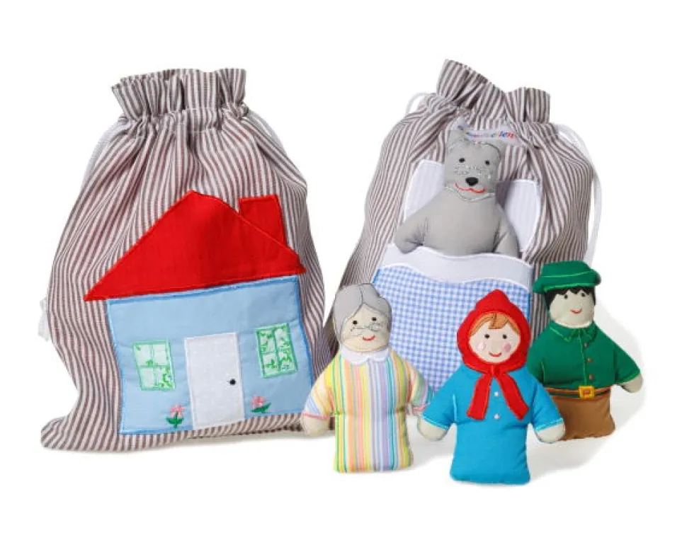 Dieser Stoffbeutel Enthalt Rotkappchen, Den Wolf, Die Grosmutter Und Den Jager – Und Dazu Sowohl Grosmutters Haus Als Auch Ihr Bett, Wo Der Bose, Gefrasige Wolf Auf Rotkappchen Wartet.