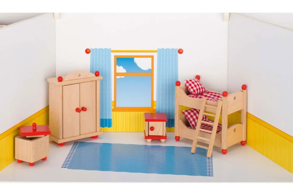 Wenn Dein Kind Ein Puppenhaus Hat, Braucht Es Naturlich Auch Einige Mobel, Dass Sich Spiele Entwickeln Konnen. In Diesem Set Gibt Es Mobel Für Das Kinderzimmer. Das Set Ist Schlicht Und Besteht Aus Einem Etagenbett, Einem Kleiderschrank, Einem Kleinen Schrank Und Einer Aufbewahrungsbox. Es Gibt Eine Bettdecke Und Ein Kissen Für Die Betten. Die Wenigen Teile Machen Es Für Dein Kind Uberschaubar Und Bietet Gleichzeitig Platz Für Eigene Einrichtungsideen. Zum Beispiel Konnte Es Kleine Bilder Malen, Die Als Kunst An Der Wand Verwendet Werden Konnen. Oder Ihr Macht Ein Kleiner Teppich, Der Auf Dem Boden Liegen Kann.