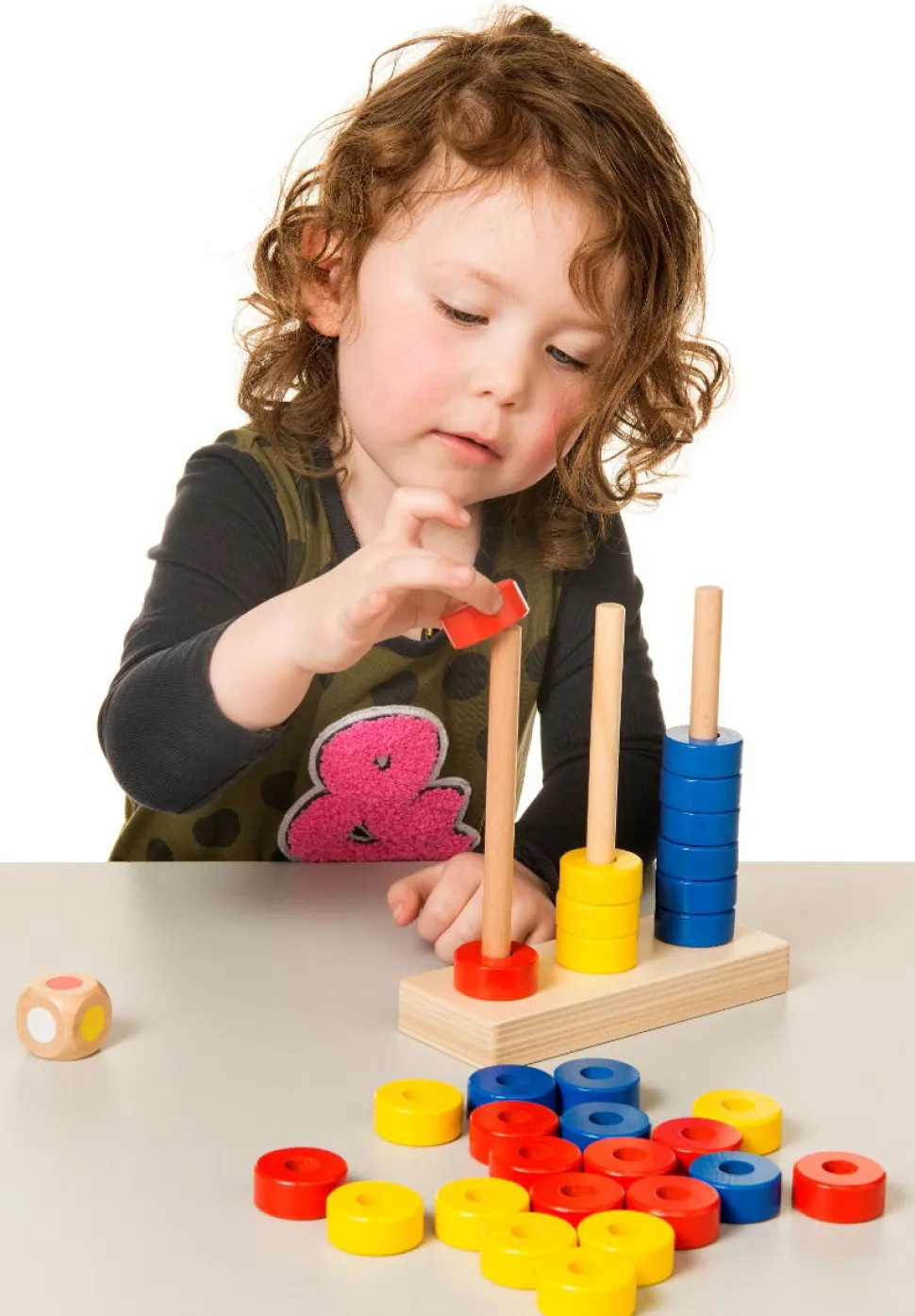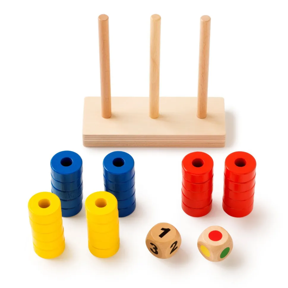 Mit Welcher Farbe Sollen Wir Anfangen? Das Kann Der Wurfel Entscheiden. Wirf Mit Den Beiden Wurfeln Und Setze Die Richtige Anzahl Ringe In Der Jeweiligen Farbe Auf Den Holzstander. Welcher Farbturm Wird Zuerst Fertig?