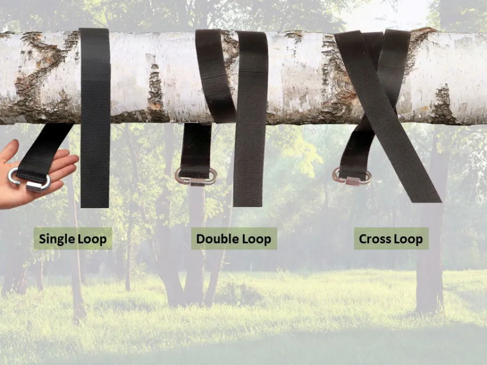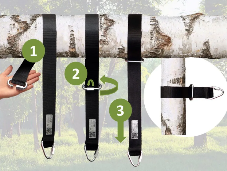 - Den Gurt Einmal Um Den Baum Schlingen Für Eine Einfache Aufhangung, Zweimal Für Eine Rutschfeste Aufhangung Und Dreimal, Wenn Du Den Baumstamm Schonen Willst – Sehe Bild.