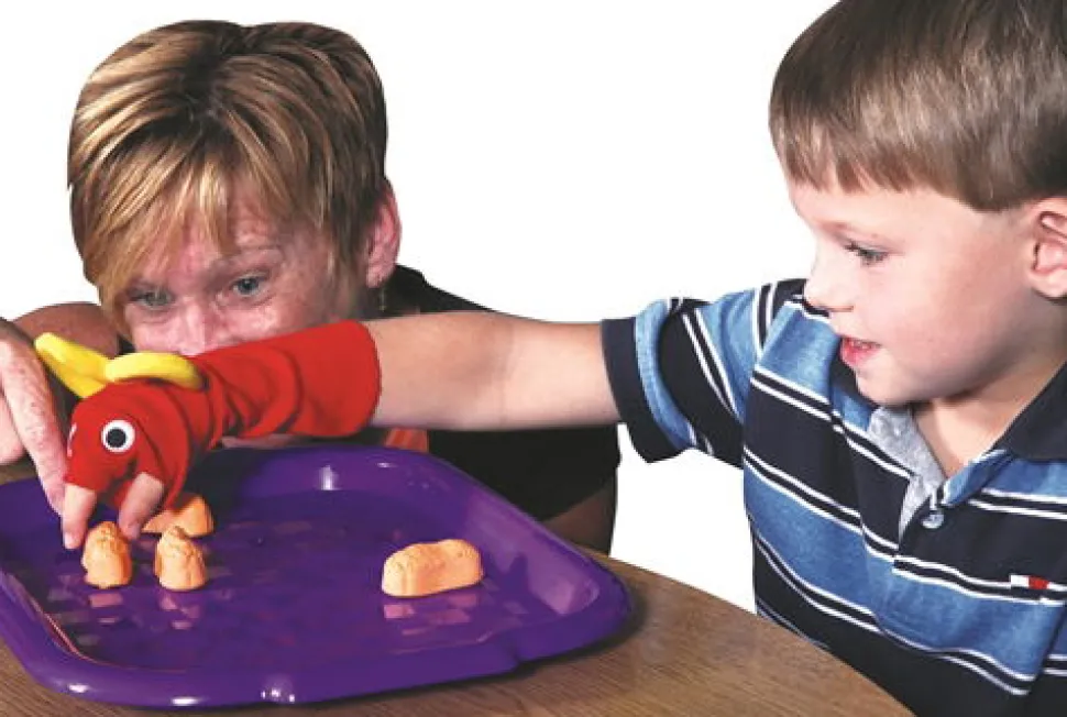 Der Handschuh Hat Nur Locher Für Daumen Und Zeigefinger, Damit Die Restlichen Finger In Der Socke Bleiben.Auf Diese Weise Lernt Das Kind, Dass Nur Die Beiden Finger Verwendet Werden Mussen.