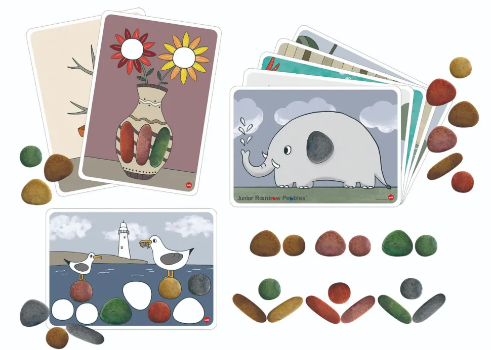 Das Set Enthalt 8 Grose Aktivitatskarten, Auf Denen Dein Kind Die Sensorischen Steine Als Mosaiksteine Verwenden Kann. Die Karten Zeigen Verschiedene Motive, Deren Leere Felder Jeweils Zu Bestimmten Sensoriksteinen Passen. Wenn Die Steine Richtig Platziert Sind, Ist Das Bild Vollstandig. Dein Kind Entwickelt Mit Diesem Spiel Die Fahigkeit, Formen Zu Erkennen Und Teile Eines Ganzen Wahrzunehmen.