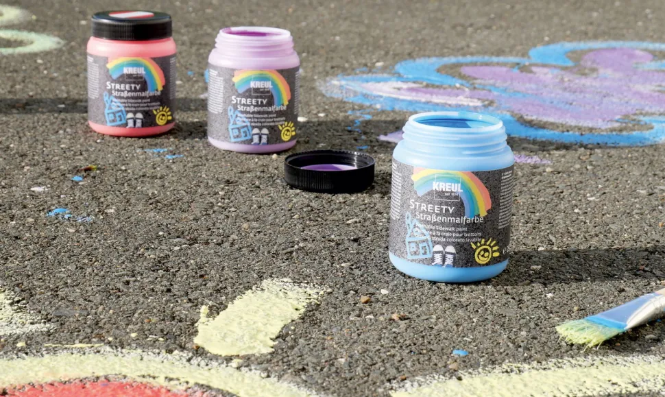 Falls Dein Kind Sowieso Schon Drausen Herumsaust, Auf Dem Trampolin Springt, Hupfspiele Spielt, Mit Frisbee Wirft Oder Mit Dem Sprungseil Springt, Stell Doch Gleich Ein Paar Behalter Mit Strasenmalfarben Bereit.