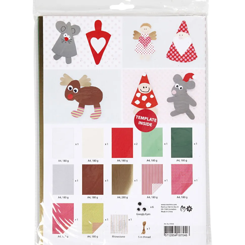 Das Set Enthalt: 8 Blatt Einfarbiges A4-Karton, 4 Blatt A4-Karton Gemustert, 1 Blatt Goldkarton, 18 Rollaugen, 5 M Goldschnur, Selbstklebende Strasssteine, Schablonenbogen.