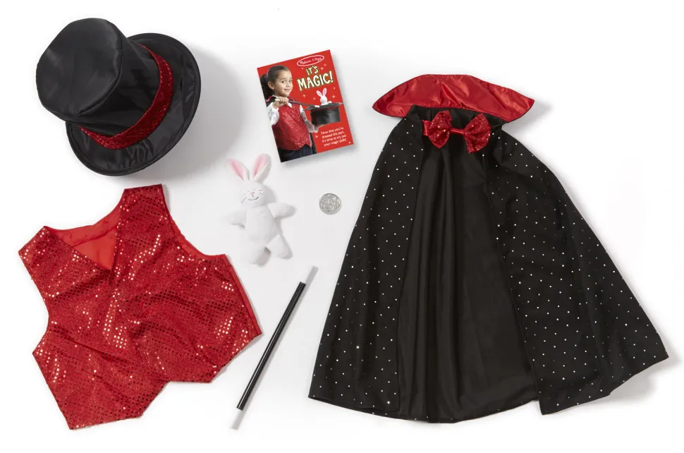 In Der Feinen Weste Aus Schonem Rotem Glitzerstoff Befindet Sich Eine Kleine Geheimtasche, Damit Das Kind Eine Munze Magisch Verschwinden Lassen Kann. In Dem Zauberer Hut Befindet Sich Ein Verstecktes Fach, Das Ein Suses Kleines Kaninchen Verbirgt. Das Set Enthalt Auch Einen Schonen Mantel Mit Fliege, Zauberstab, Munze Und Eine Karte Mit Ideen Für Zaubertricks.