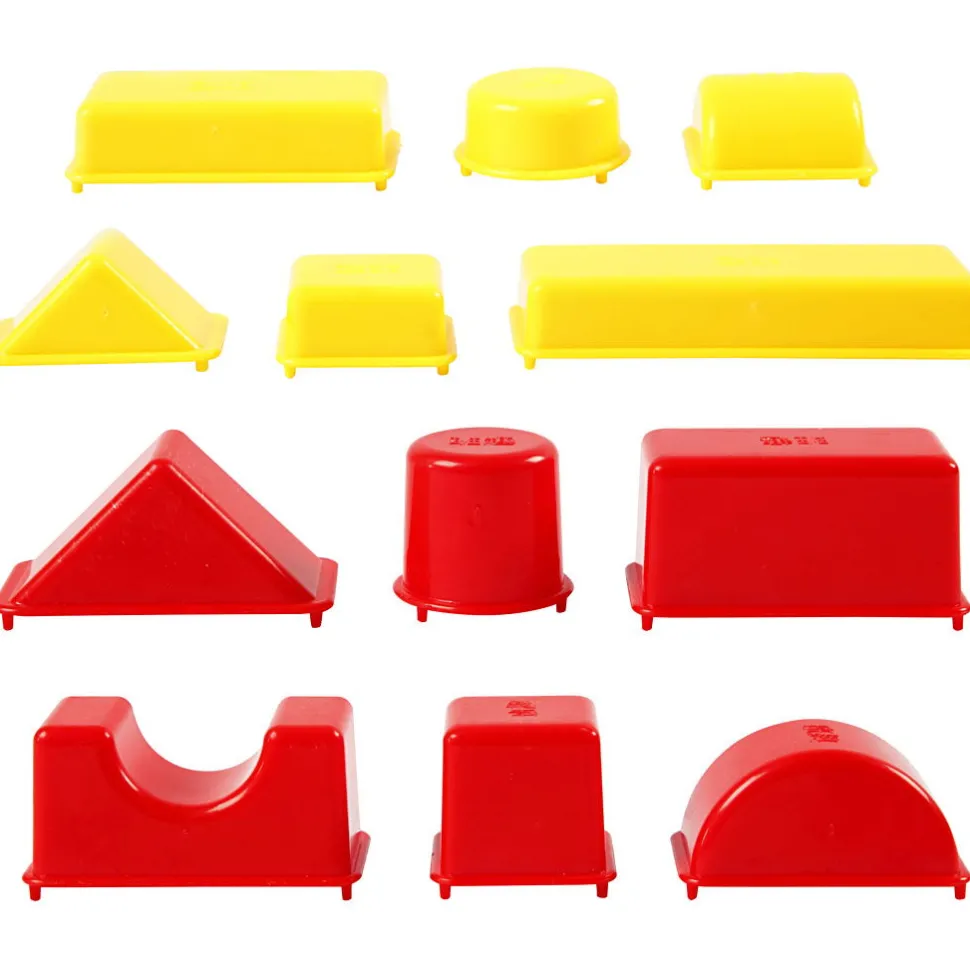 Kleine Sandformen In Gelb Und Rot, Die Sich Gut Für Spielsand Eignen.Das Paket Enthalt 12 Verschiedene Geometrische Formen.Hier Kann Dein Kind Muster Anfertigen Oder Versuchen, Hauser Zu Bauen, Indem Es Formen Zusammensetzt.